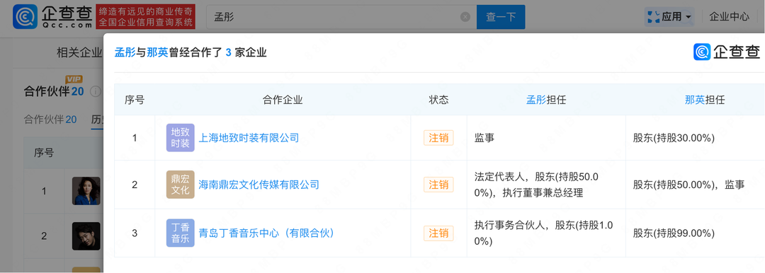 企查查APP显示,那英名下关联9家企业,其中6家已注销,北京福月音乐工作室(普通合伙)、北京银河树文化传媒有限公司、绍兴上虞艾泽拉思投资管理合伙企业(有限合伙)为存续状态。
